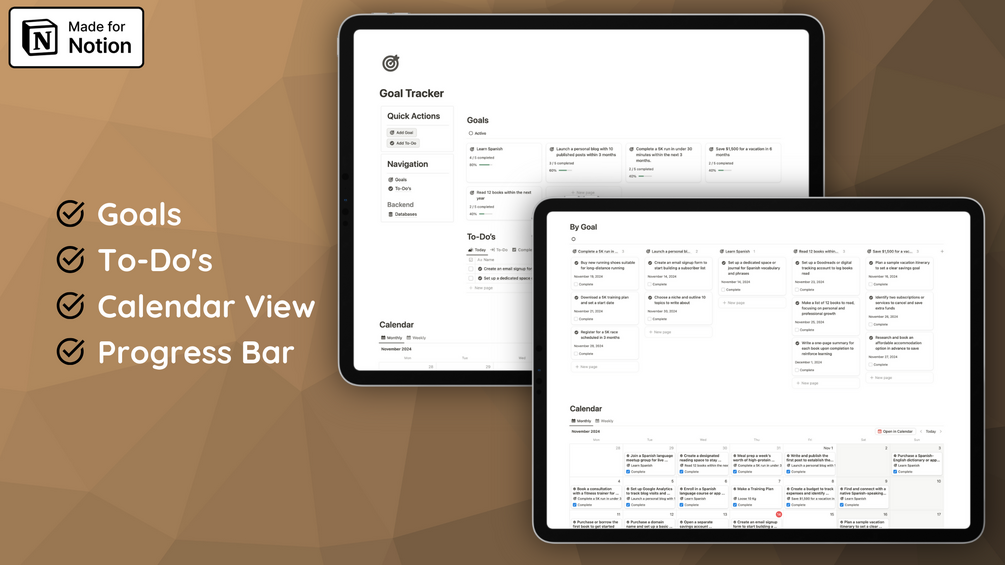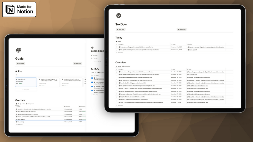 Stay focused and organized on your path to success with this intuitive Goal Tracker template. Designed to help you set, break down, and achieve your goals, this tool offers a seamless way to manage each of your ambitions with precision. Each goal can be accompanied by its own set of actionable to-do items, making it easy to track progress step-by-step. The minimalist design keeps everything clear and clutter-free. Perfect for anyone looking to stay organized and motivated, this template is your ideal companion for productive and focused goal achievement.
