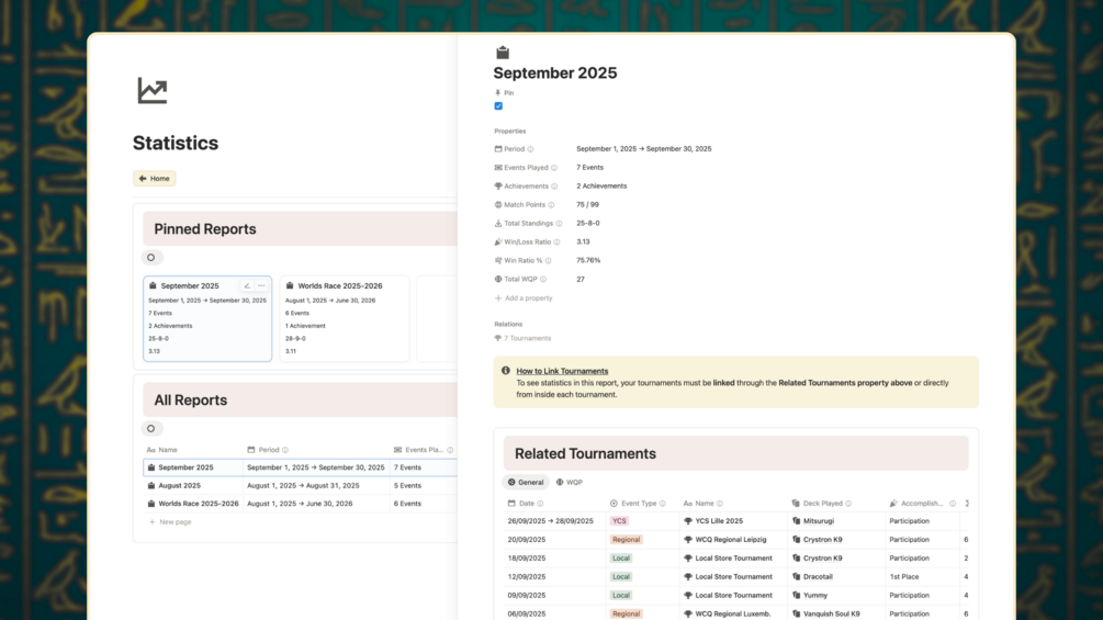 The ultimate Notion template for competitive duelists. The Millennium Companion is designed to help you prepare smarter, track your tournaments, and grow as a player. With a structured system for training, performance tracking, and reflection, you’ll always be one step ahead when it matters most.