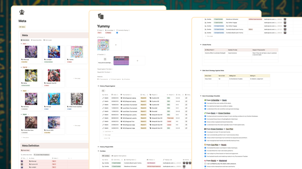 Everything from decks, testing, and tournaments is connected in one clean, easy-to-use Notion dashboard.