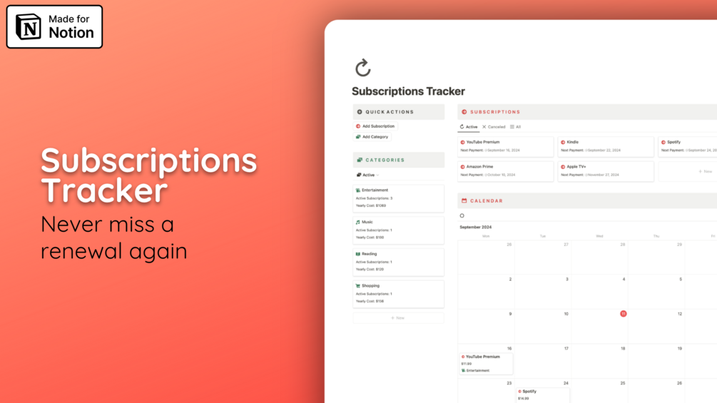 Introducing the Subscriptions Tracker template – the ultimate solution for managing all your recurring payments with ease. Its intuitive interface makes it simple to stay organized and keep track of your subscriptions. Easily add new subscriptions or cancel existing ones, filter them by categories, and view your upcoming payments in a convenient calendar format. Managing your subscriptions has never been easier!